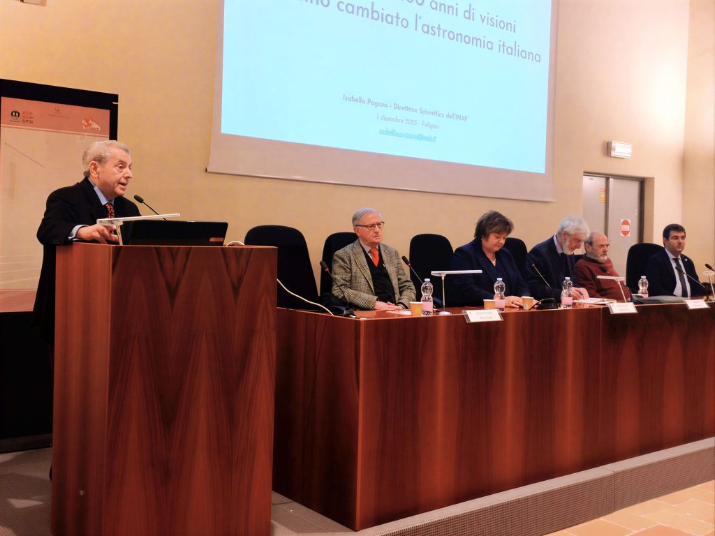 Nella foto: Pierluigi Mingarelli - Direttore del Laboratorio di Scienze Sperimentali di Foligno; Maurizio Renzini - Presidente del Laboratorio di Scienze Sperimentali; Isabella Pagano - Direttrice Scientifica dell’Istituto Nazionale di Astrofisica; Piero Bianucci, scrittore e giornalista scientifico; Maurizio Busso - già Professore Ordinario di Astrofisica, Università degli Studi di Perugia; Salvatore Guglielmino - responsabile Alta Formazione INAF