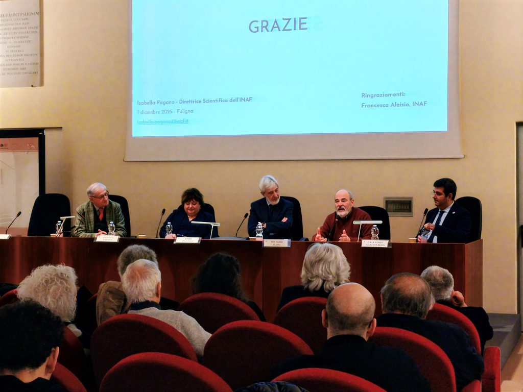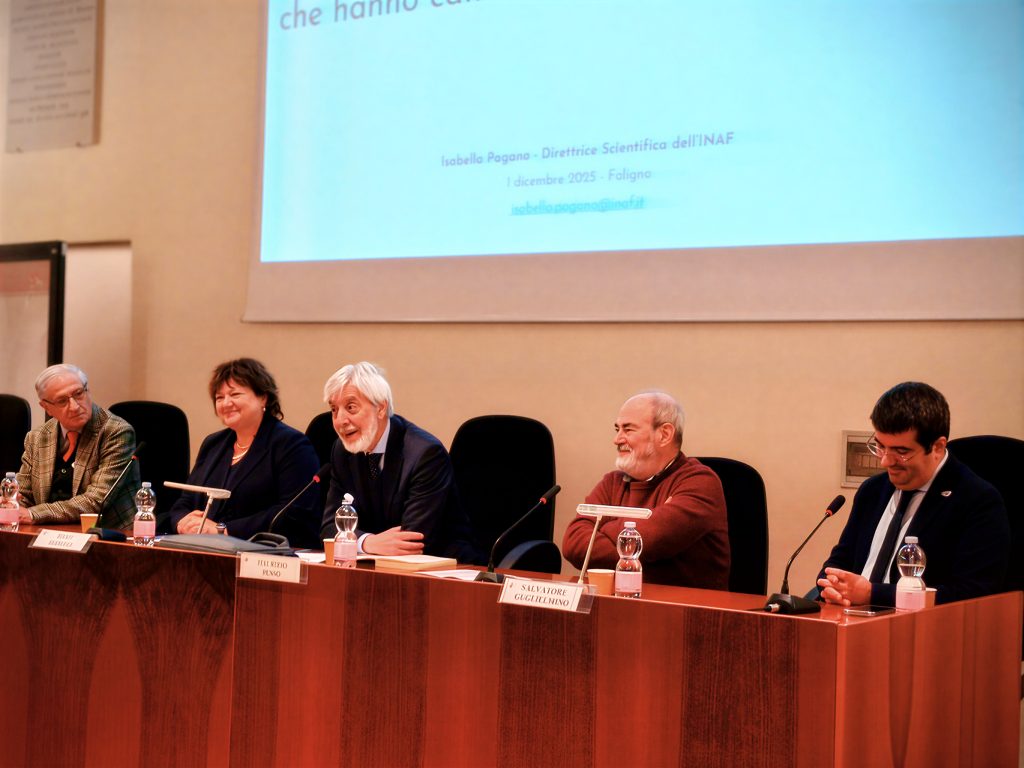 Nella foto: Pierluigi Mingarelli - Direttore del Laboratorio di Scienze Sperimentali di Foligno; Maurizio Renzini - Presidente del Laboratorio di Scienze Sperimentali; Isabella Pagano - Direttrice Scientifica dell’Istituto Nazionale di Astrofisica; Piero Bianucci, scrittore e giornalista scientifico; Maurizio Busso - già Professore Ordinario di Astrofisica, Università degli Studi di Perugia; Salvatore Guglielmino - responsabile Alta Formazione INAF