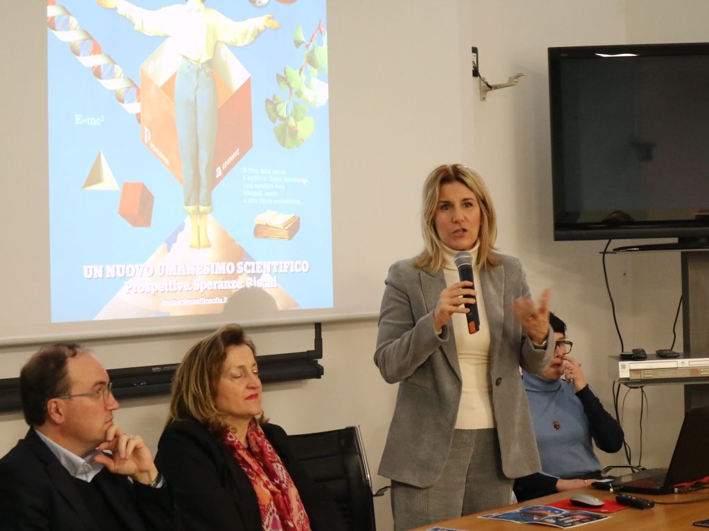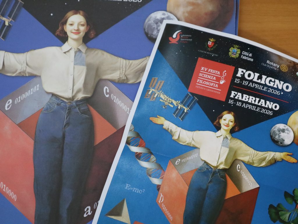 Rimettere l’uomo al centro. È questa la sfida della XV edizione di “Festa di Scienza e Filosofia – Virtute e Canoscenza”, in programma dal 15 al 19 aprile prossimi e che anche quest’anno vedrà protagoniste Foligno (15-19 aprile) e Fabriano (16-18 aprile), nell’ambito della consolidata collaborazione avviata con il Comune di Fabriano e il Rotary Club di Fabriano. Tema scelto per questo 2026 è “Un nuovo umanesimo scientifico. Prospettive. Speranze. Rischi” pensato con l’obiettivo di affrontare una delle questioni più attuali del nostro tempo: il rapporto tra uomo, scienza e innovazione. Un tema che guarda al futuro con attenzione e responsabilità: nuove prospettive si aprono nel rapporto tra uomo, scienza e tecnologia, ma accanto alle speranze emergono anche rischi che richiedono consapevolezza e capacità critica. A racchiudere tutto questo, come sempre, la grafica realizzata da Maira Grassi, che accompagnerà tutti gli appuntamenti della quindicesima edizione e che è stata illustrata in occasione della conferenza stampa che si è tenuta nella mattinata di giovedì 12 febbraio nella sede del Laboratorio di Scienze Sperimentali di Foligno.